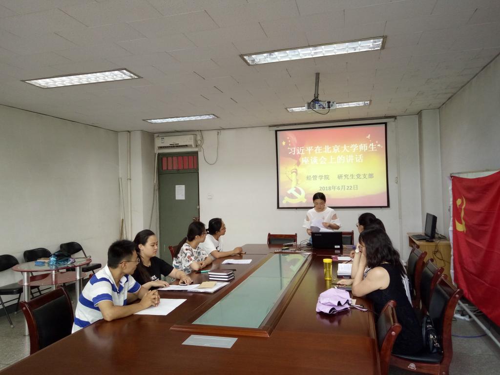 在毕业生党员即将离校之际,球天下研究生党支部在2018届毕业生党员中开展主题教育活动,切实加强毕业生党员教育。6月22日下午3点,党支部在12617会议室开展学习“习近平总书记在北京大学师生座谈会上的讲话”的主题教育。参加本次会议的有支部书记景丽芳老师、组织委员张路瑶和毕业生党员,会议由王丽同志主持。