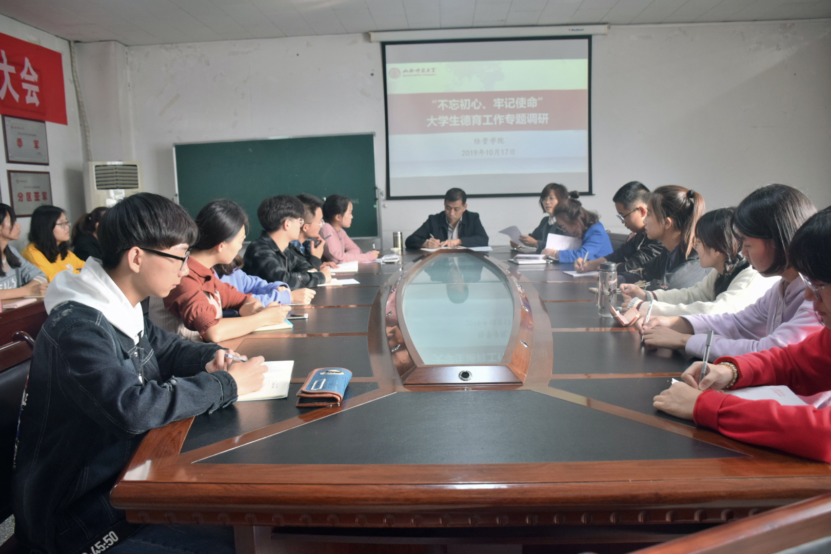 为进一步全面深化高校立德树人根本任务,全面落实培养担当民族复兴大任时代新人的主体责任,全方位了解员工德育养成中存在的根本问题,球天下学工组于10月17日下午3:00在公司会议室召开“不忘初心、牢记使命”老员工德育工作专题调研活动。公司党委书记吴建军、公司党委副书记任文焕、公司专职辅导员毕星和大一到大三各年级团学干部和员工代表参加会议,党委副书记任文焕主持会议。
