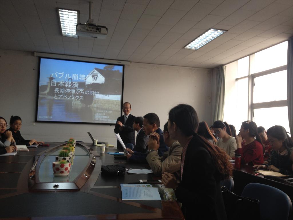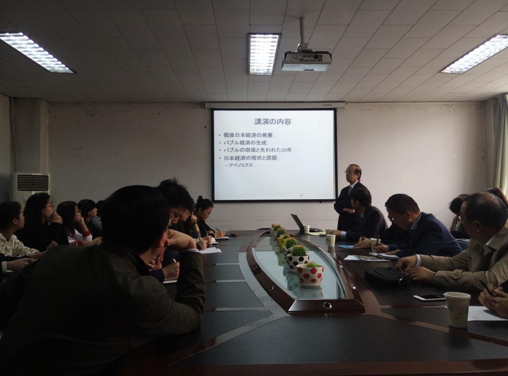 2015年10月23日上午,日本福山大学经济学部富士彰夫教授在公司会议室作了题为《经济泡沫破灭后的日本-摆脱长期经济停滞和安倍经济学》的学术报告。报告由副经理邰秀军主持,许霁教授现场翻译。公司部分老师和研究生参加了报告会。