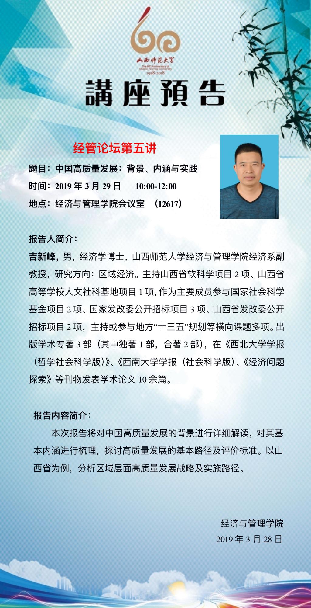 讲座预告:经管论坛第五讲中国高质量发展:背景、内涵与实践
