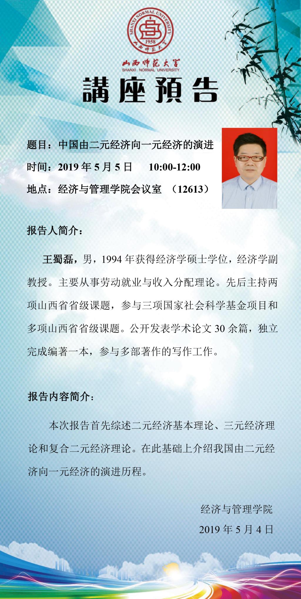 经管论坛第八讲预告:王蜀磊副教授作“中国由二元经济向一元经济的演进”学术报告
