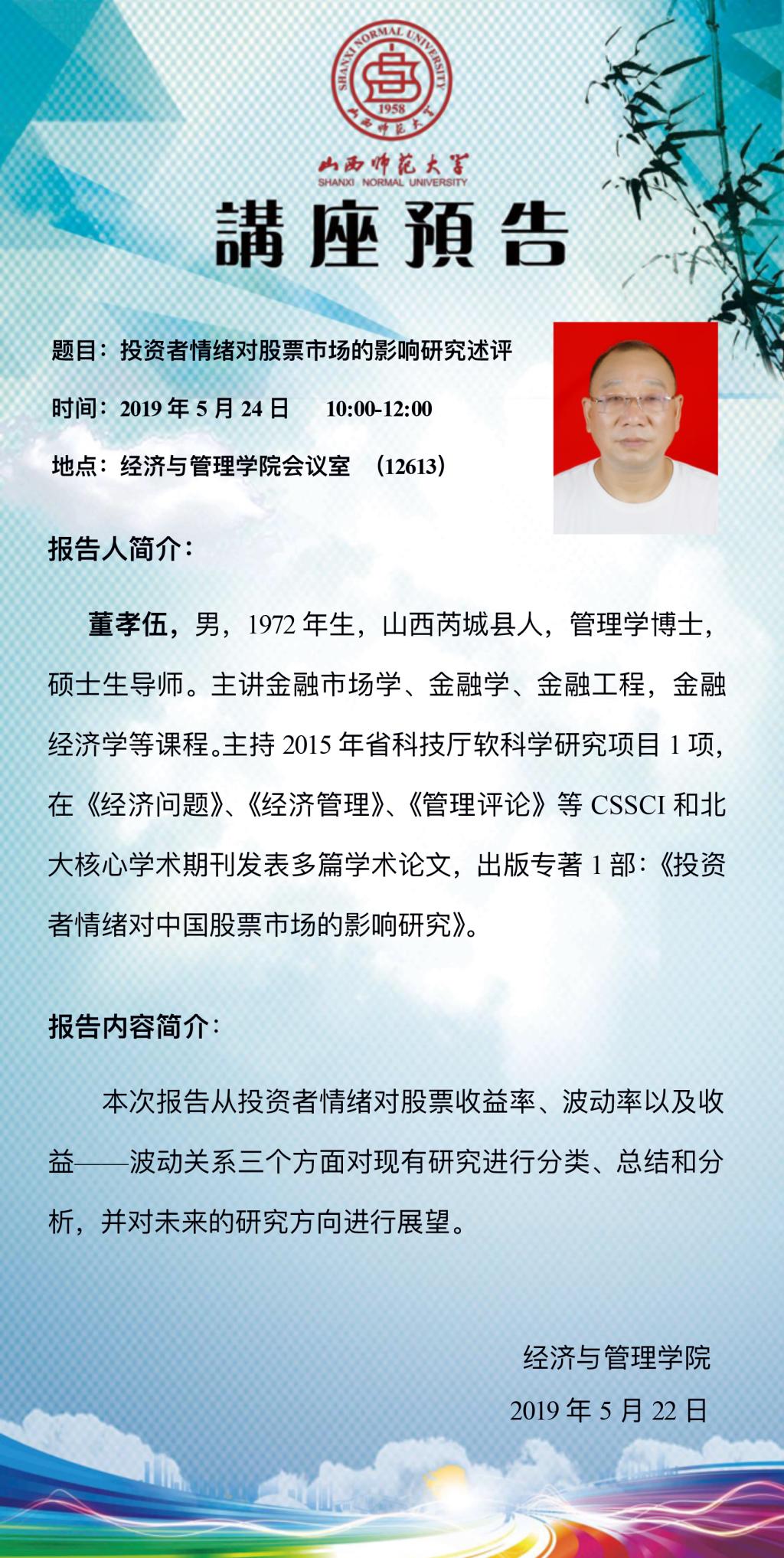 经管论坛第十一讲预告:董孝伍副教授作“投资者情绪对股票市场的影响研究述评”学术报告