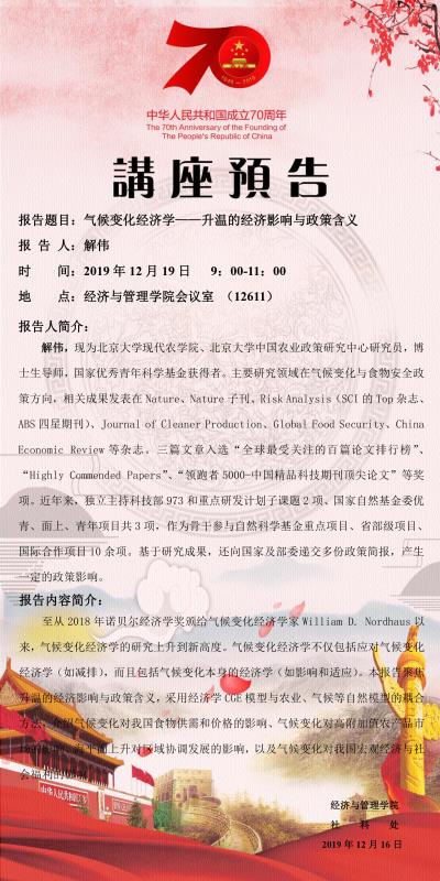 讲座预告:气候变化经济学-升温的经济影响与政策含义