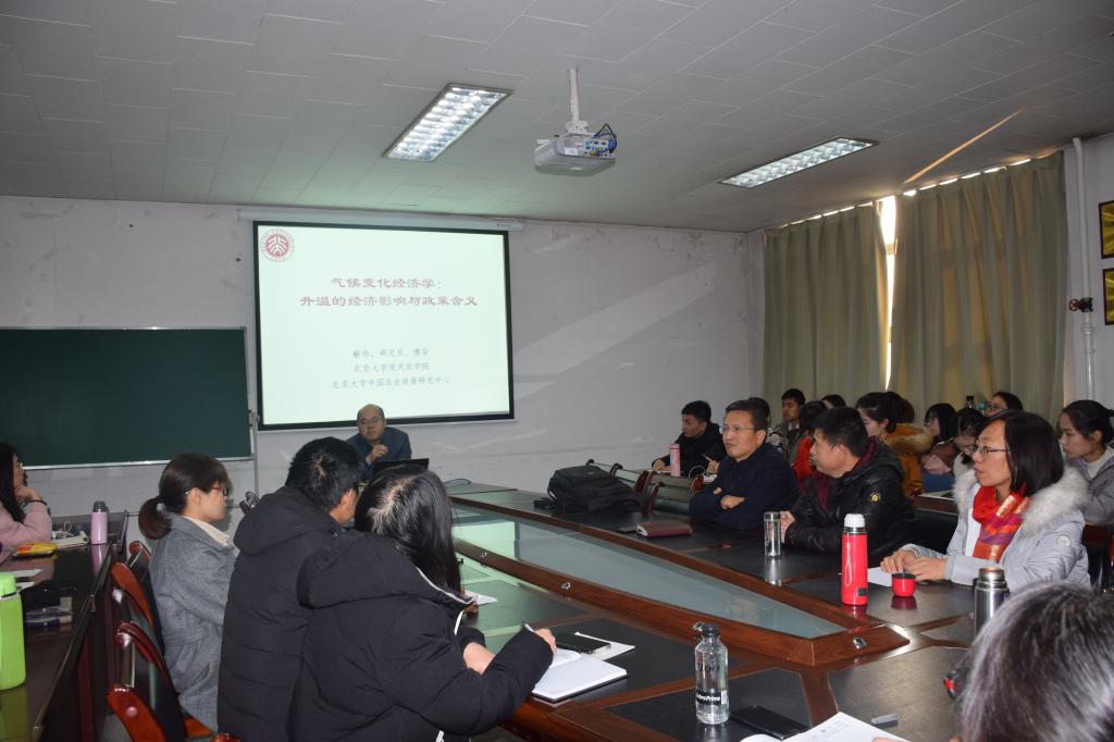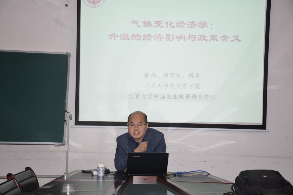 12月19日上午,北京大学现代农公司解伟研究员应邀来公司做了题为“气候变化经济学—升温的经济影响与政策含义”的学术报告。报告会由副经理邰秀军主持,公司部分教师与研究生参加了此次报告会。