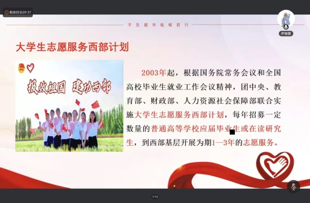 分享会上,尹晓霞结合自身基层服务经历,系统介绍了服务地生活适配、工作内容细节与个人职业发展规划等环节的实战经验,并以亲身实践为例,深入剖析基层服务难点与成长感悟。互动环节同学们踊跃提问,线上交流气氛热烈。